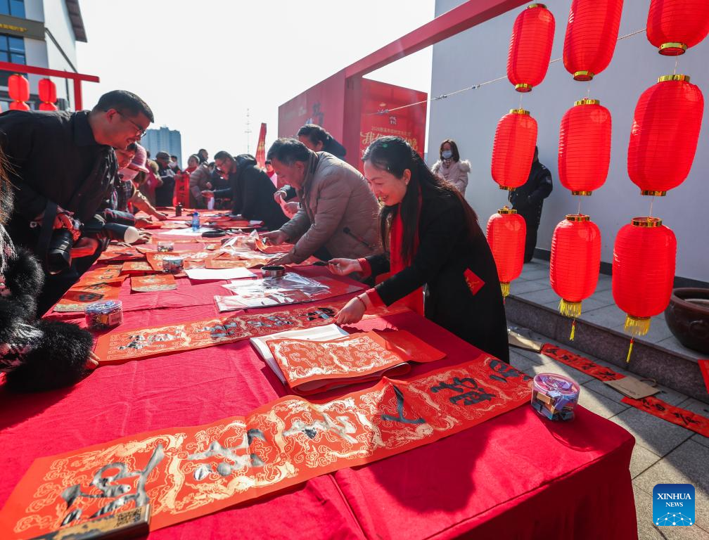 Chinese calligraphy enthusiasts write spring couplets and Chinese character "Fu", which means good fortune, for villagers during a folk customs event to celebrate the upcoming Spring Festival in Wan'anzhuang Village, Zhuoxiang Town of Cixi City, east China's Zhejiang Province, Jan. 22, 2026. (Xinhua/Xu Yu)