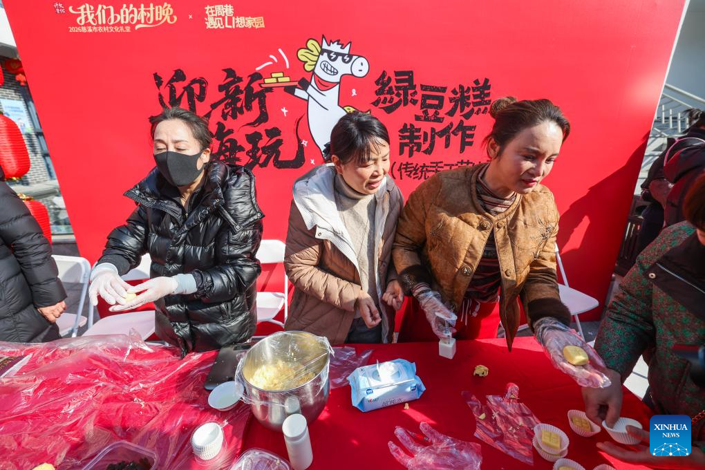 Villagers experience making mung bean cakes during a folk customs event to celebrate the upcoming Spring Festival in Wan'anzhuang Village, Zhuoxiang Town of Cixi City, east China's Zhejiang Province, Jan. 22, 2026. (Xinhua/Xu Yu)