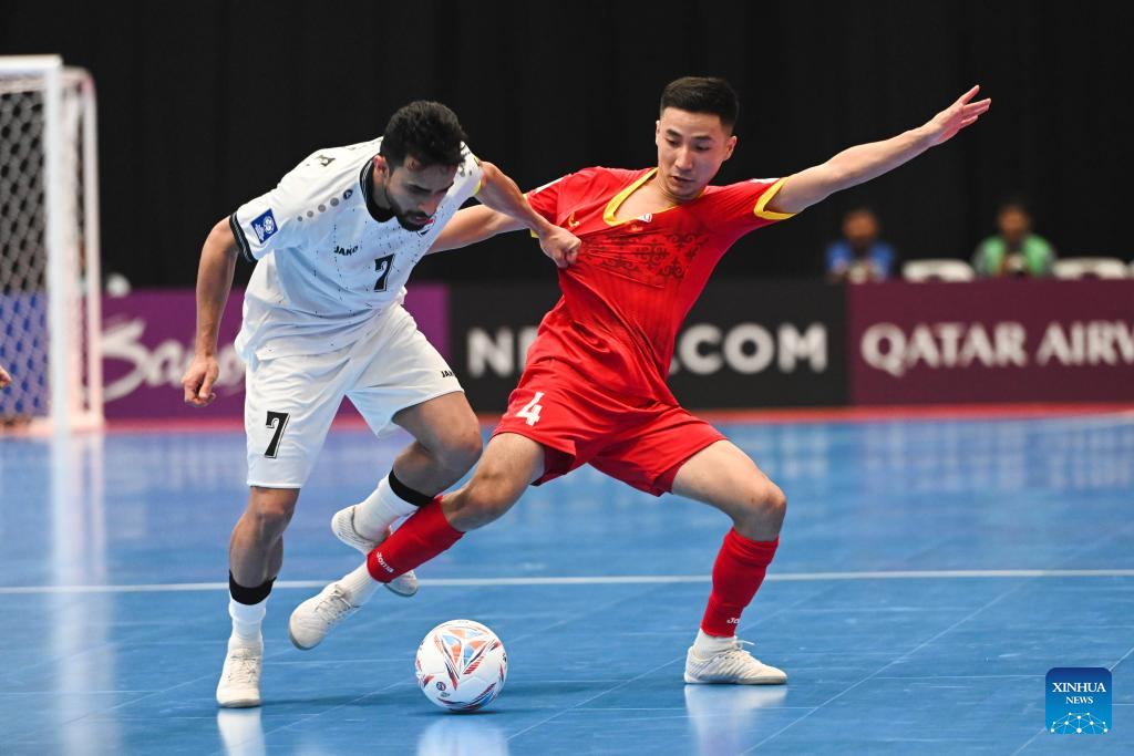 Salim Faisal Abed Al-Husaynat (R) of Iraq vies with Iliasov Bektur of Kyrgyz Republic during the group A match between Iraq and Kyrgyz Republic at the AFC Futsal Asian Cup 2026 in Jakarta, Indonesia, Jan. 27, 2026. (Xinhua/Zulkarnain)