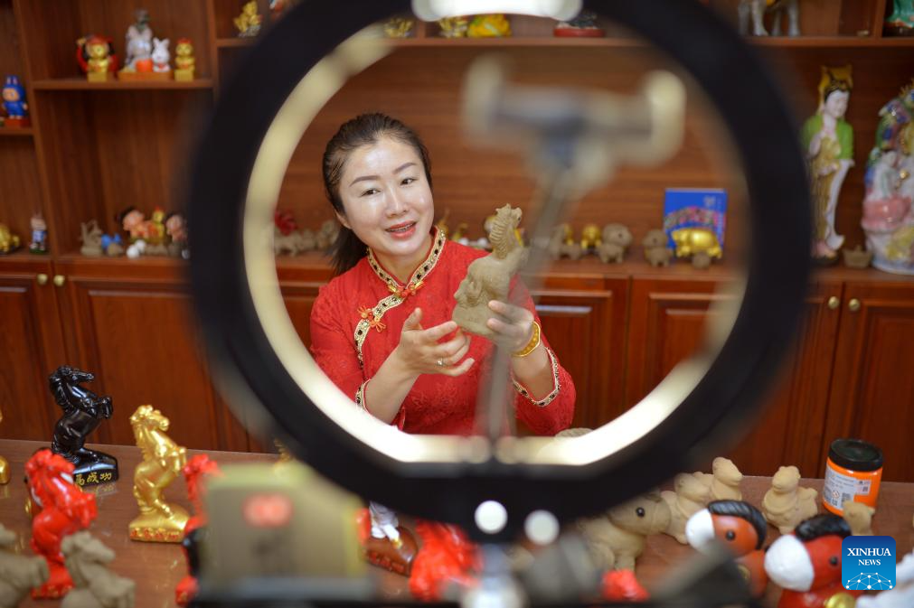 A woman promotes horse-themed clay figurines via livestreaming at a workshop in Chengyang District of Qingdao, east China's Shandong Province, on Jan. 21, 2026. With the Year of the Horse approaching, a wide range of horse-themed cultural products, from museum souvenirs to traditional crafts, are gaining popularity in east China's Shandong Province. (Photo by Wang Haibin/Xinhua)