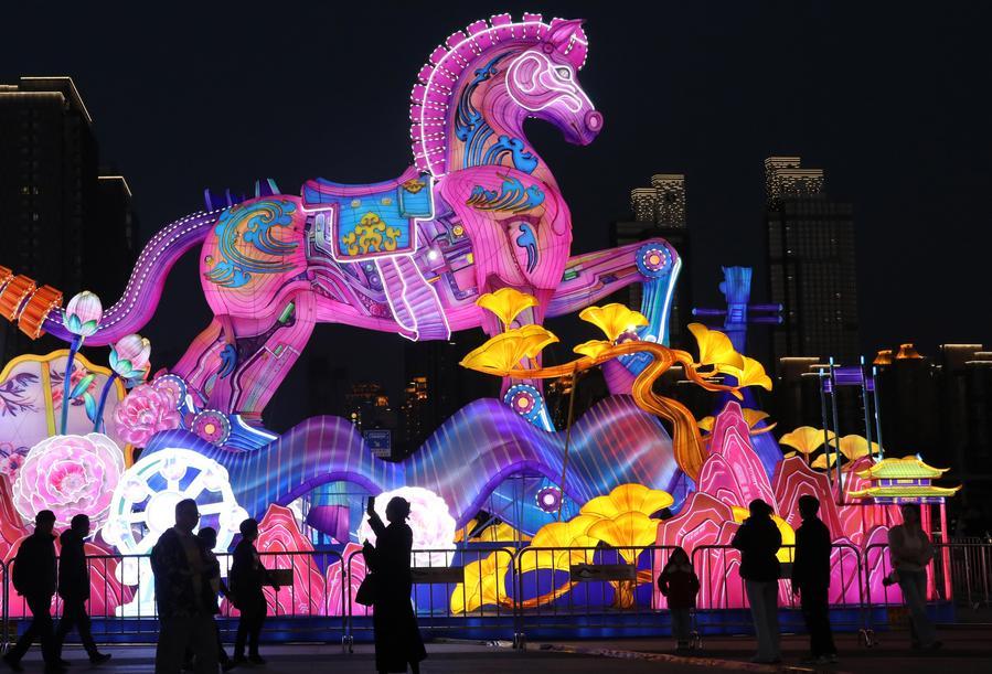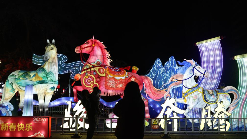 People view a horse-themed light installation at the Shishan Culture Square in Suzhou City, east China's Jiangsu Province, Feb. 14, 2026. (Photo by Hang Xingwei/Xinhua)