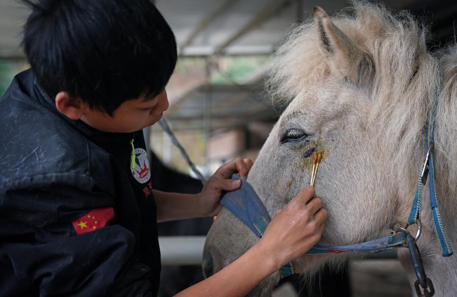 Wu Tianhao tends to the wound of a horse at Tanlun Equestrian Town in Yihuang County, east China's Jiangxi Province, Dec. 23, 2025. (Xinhua/Wan Xiang)