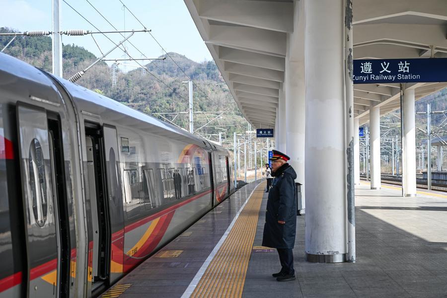 The high-speed train G3360 bound to Yan'an of northwest China's Shaanxi Province is pictured at Zunyi Railway Station in Zunyi City, southwest China's Guizhou Province, Jan. 26, 2026. (Xinhua/Yang Wenbin)