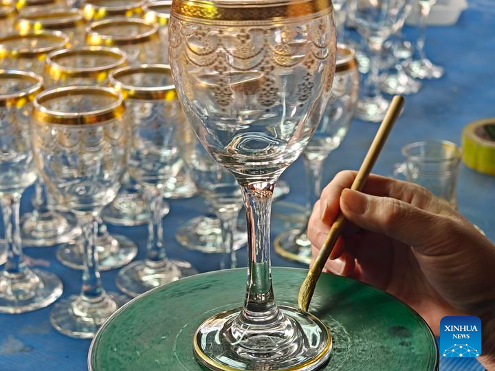 This photo taken with a mobile phone shows a staff member painting a golden border around the foot of a glass cup in Qixian County, north China's Shanxi Province, Jan. 8, 2026. (Xinhua/Wang Hao)