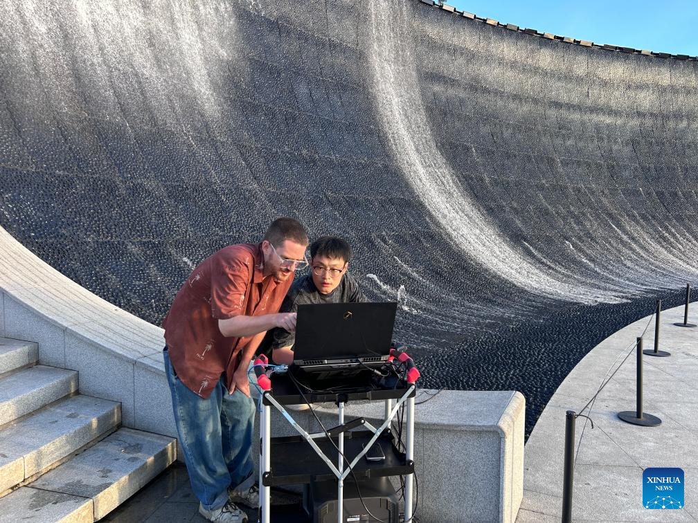 Nikk Mitchell (L), founder and CEO of Hanghzou-based VR production company FXG, conducts shooting with his colleague at the Yanguan ancient town in Jiaxing, east China's Zhejiang Province, June 13, 2025. (Xinhua)