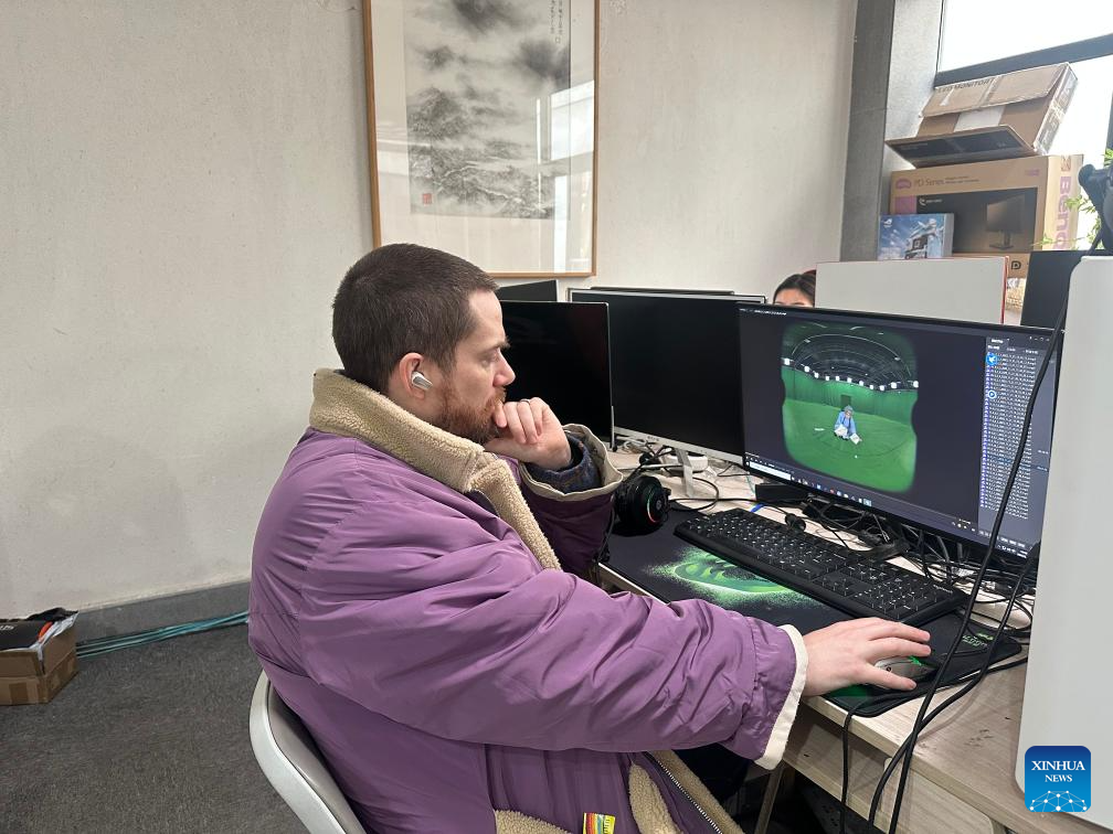 Nikk Mitchell, founder and CEO of VR production company FXG, checks an image on his computer at his company based in Hangzhou, east China's Zhejiang Province, Feb. 27, 2026. (Xinhua)