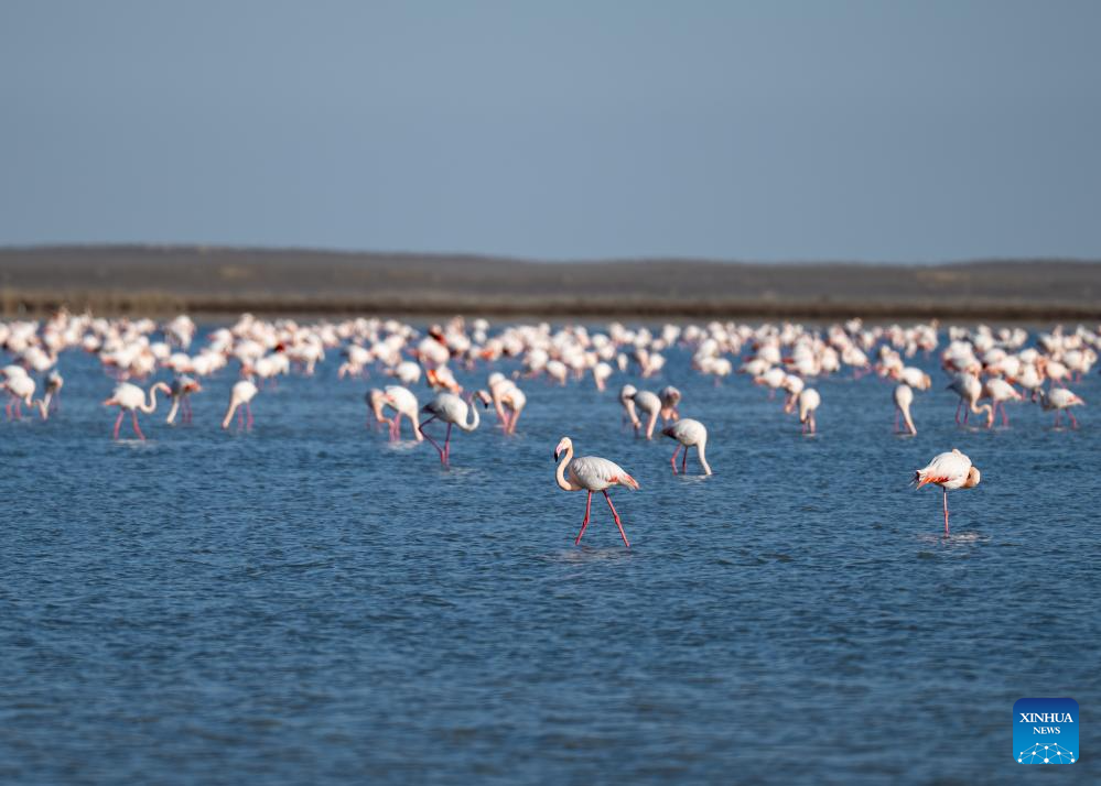 This photo taken on March 10, 2026 shows flamingos at Karakol Lake on the outskirts of Aktau, Kazakhstan. A flock of flamingos have settled on the Karakol Lake in the suburbs of Aktau, southwest Kazakhstan's Mangystau Region, before continuing on their spring migration. (Xinhua/Li Renzi)