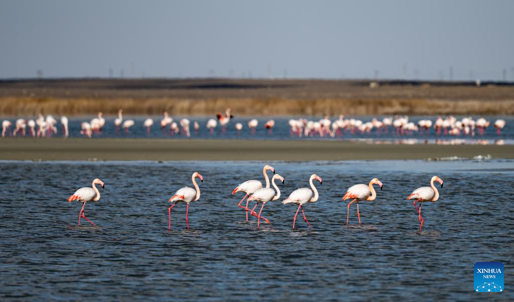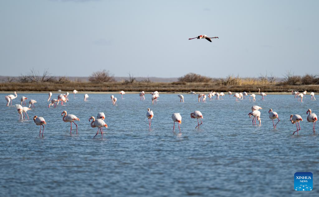 Flamingos are pictured in Karakol Lake on the outskirts of Aktau, Kazakhstan, on March 10, 2026. A flock of flamingos have settled on the Karakol Lake in the suburbs of Aktau, southwest Kazakhstan's Mangystau Region, before continuing on their spring migration. (Xinhua/Li Renzi)
