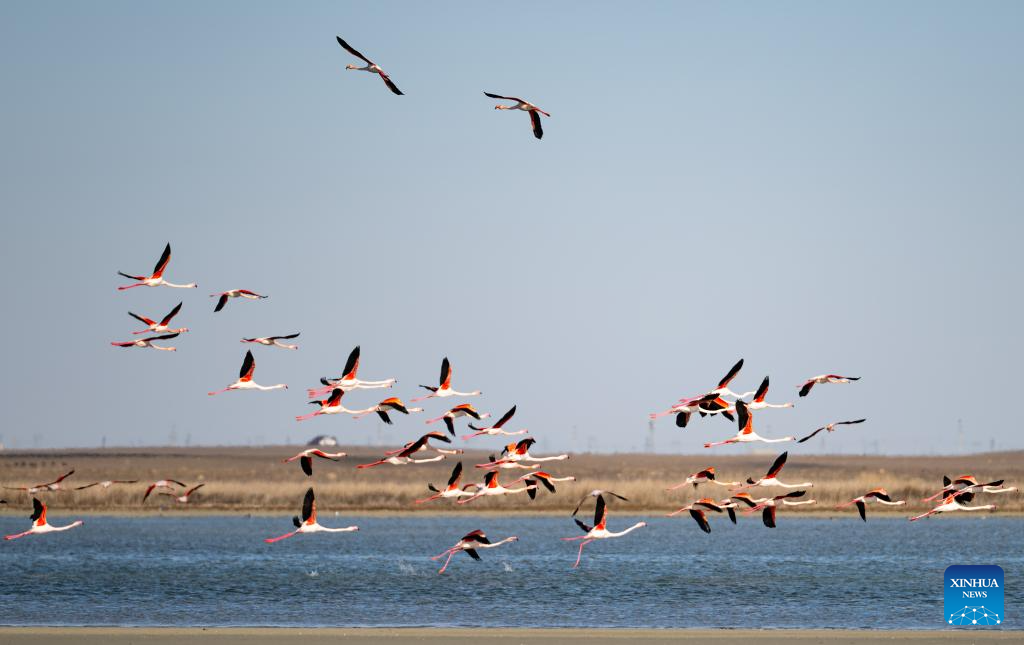 Flamingos fly over Karakol Lake on the outskirts of Aktau, Kazakhstan, on March 10, 2026. A flock of flamingos have settled on the Karakol Lake in the suburbs of Aktau, southwest Kazakhstan's Mangystau Region, before continuing on their spring migration. (Xinhua/Li Renzi)