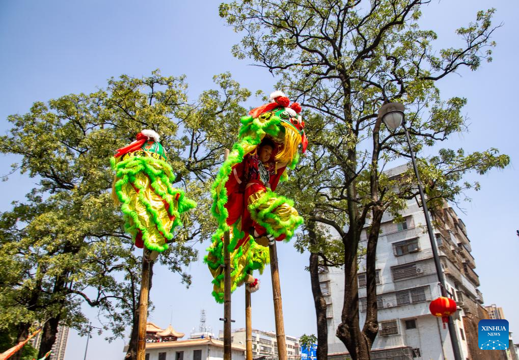 This photo taken on March 11, 2026 shows a lion dance performance during the Chenghuang temple fair in Jieyang, south China's Guangdong Province. The Chenghuang temple fair, held on the 23rd day of the first month on the traditional Chinese calendar, is one of the major traditional folk cultural events in Jieyang. (Photo by Huang Guangping/Xinhua)