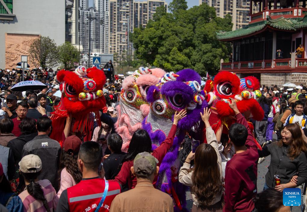 This photo taken on March 11, 2026 shows a lion dance performance during the Chenghuang temple fair in Jieyang, south China's Guangdong Province. The Chenghuang temple fair, held on the 23rd day of the first month on the traditional Chinese calendar, is one of the major traditional folk cultural events in Jieyang. (Xinhua/Deng Hua)