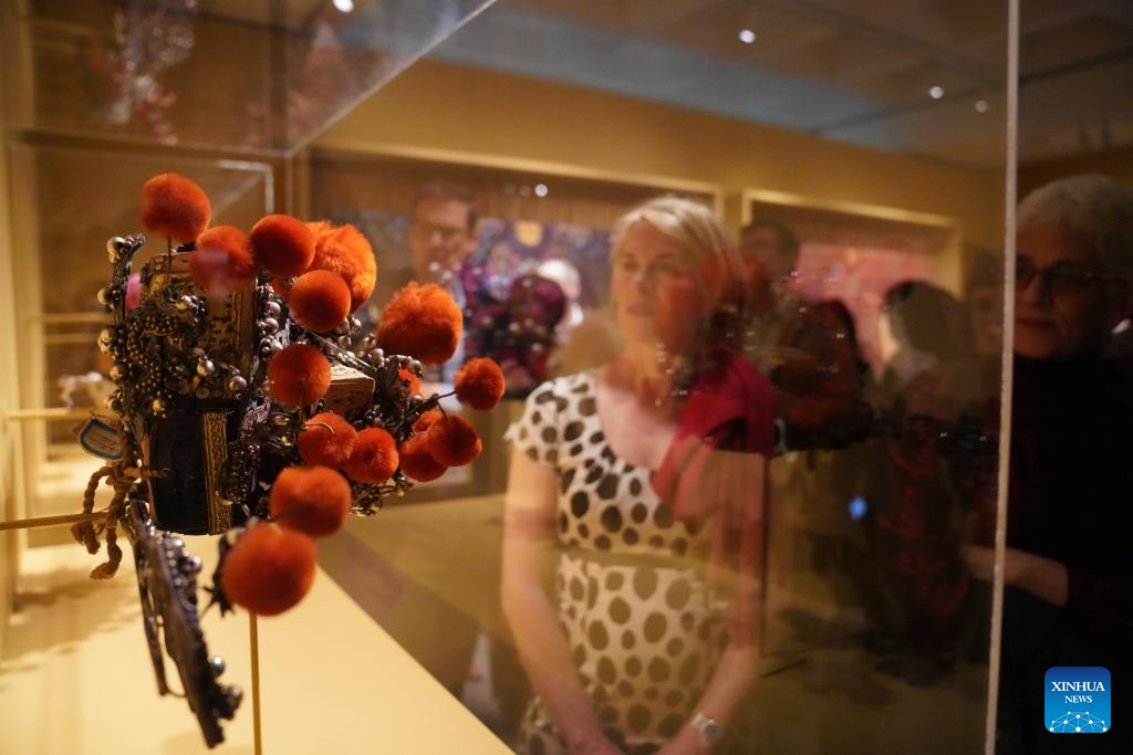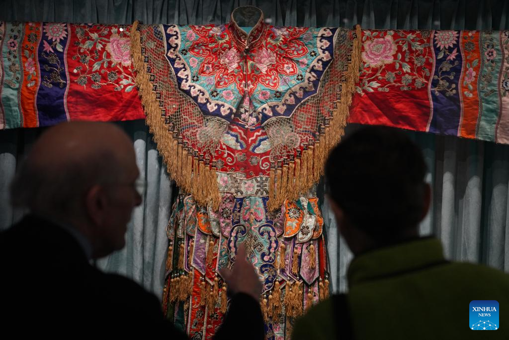 People visit an exhibition titled "The Dancing Goddess: Mei Lanfang in America" in New York, the United States, on March 11, 2026. The exhibition, featuring stage costumes, photographs, performance videos, original production props, and artwork of China's renowned Peking Opera artist Mei Lanfang, opened here on Wednesday to mark the 96th anniversary of his 1930 North American tour. (Xinhua/Zhang Fengguo)