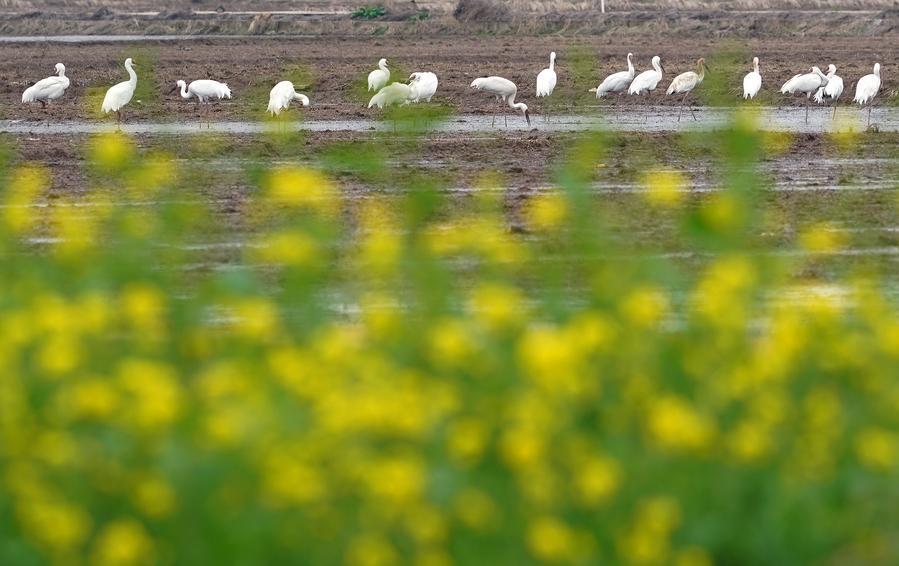 This photo taken on Feb. 27, 2026 shows migratory birds perching and foraging in Yugan County, east China's Jiangxi Province. Poyang Lake, China's largest freshwater lake and an extensive wetland, is a vital wintering and stopover site along the East Asian-Australasian Flyway. (Xinhua/Wan Xiang)