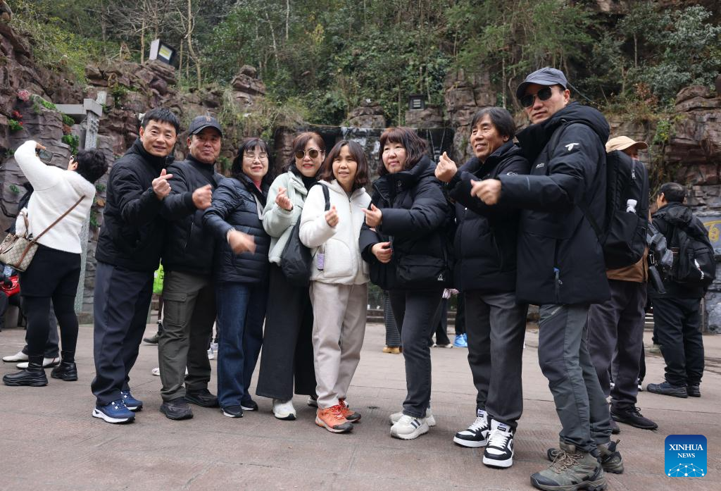 Malaysian tourists pose for group photos at Zhangjiajie National Forest Park in central China's Hunan Province, Jan. 2, 2026. (Photo by Wu Yongbing/Xinhua)