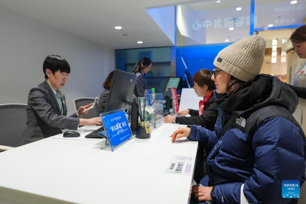 Italian tourist Chiara Manuzzi (R, front) enquires tax refund policies at a shopping mall in Beijing, capital of China, Jan. 6, 2026. (Xinhua/Ju Huanzong)