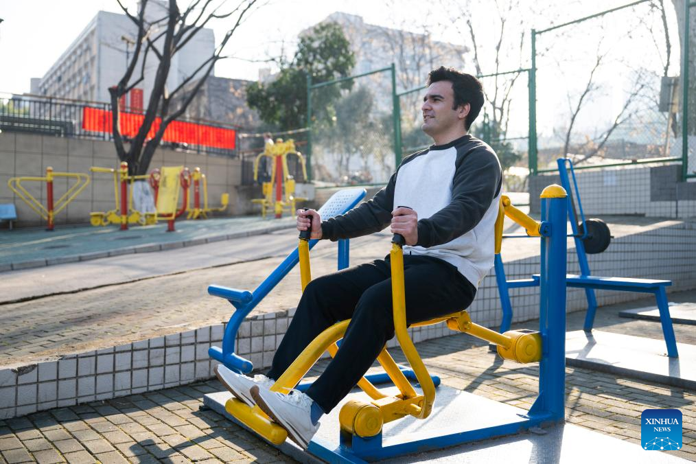 Mauri Joseph Tualaulelei from Samoa does physical exercise at Central China Normal University in Wuhan City, central China's Hubei Province, Jan. 8, 2026. Tualaulelei is pursuing a master's degree in Physical Education at the university. He has been in China since 2017. (Xinhua/Wu Zhizun)