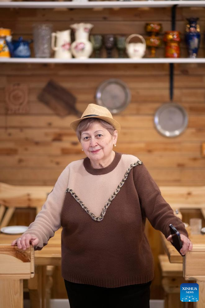 Oganesian Aida poses for a photo at a restaurant in Suifenhe City, northeast China's Heilongjiang Province, Jan. 8, 2026. The 62-year-old Oganesian Aida from Russia settled in Suifenhe two years ago at the invitation of her Chinese friend. (Xinhua/Zhang Tao)
