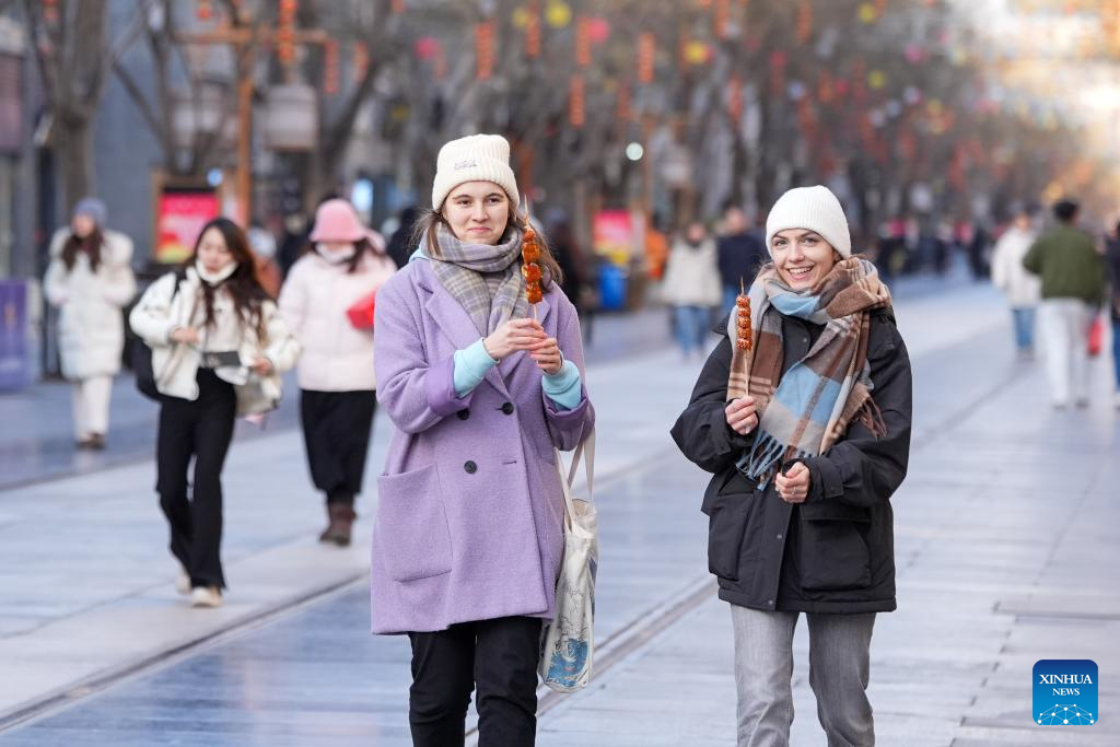 German tourists Martha (R) and Sofie taste Tanghulu, a popular Chinese winter snack of crispy sugar-coated hawthorns, at Qianmen Street in Beijing, capital of China, Jan. 7, 2026. (Xinhua/Ju Huanzong)