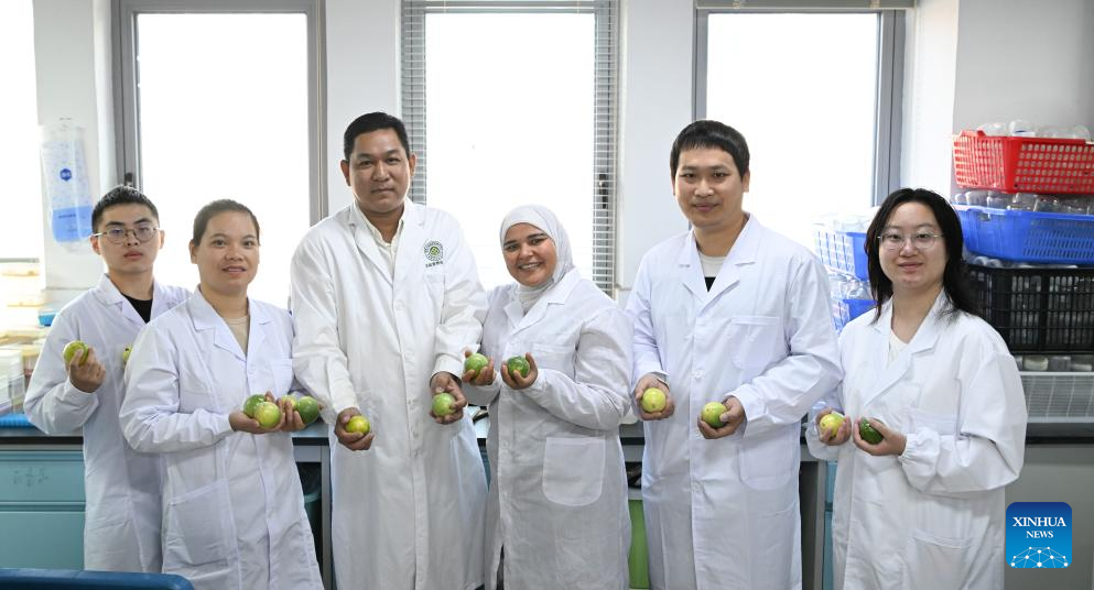 Fardous Muhammad Tawfik Abdelwanis (3rd R) poses for a group photo with her colleagues at the Chinese Academy of Tropical Agricultural Sciences in Haikou, south China's Hainan Province, Jan. 7, 2026. Fardous Muhammad Tawfik Abdelwanis from Egypt is currently a researcher at the Chinese Academy of Tropical Agricultural Sciences in south China's Hainan. Specializing in plant medicinal research, she is studying passion fruit cultivation to address the high cost of imports in Egypt and utilize the fruit's rich active ingredients. (Xinhua/Yang Guanyu)