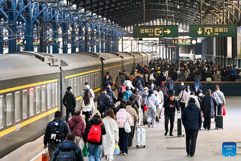 Passengers are pictured at a platform of Nanjing Railway Station in Nanjing, east China's Jiangsu Province, March 13, 2026. The 2026 Spring Festival travel rush comes to an end on Friday. (Photo by Su Yang/Xinhua)