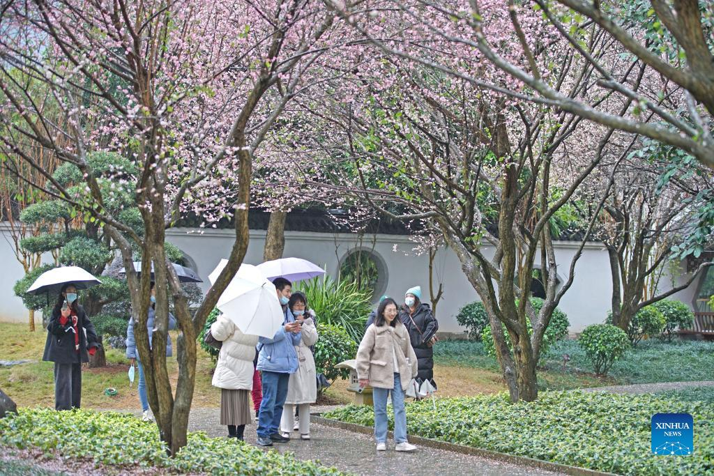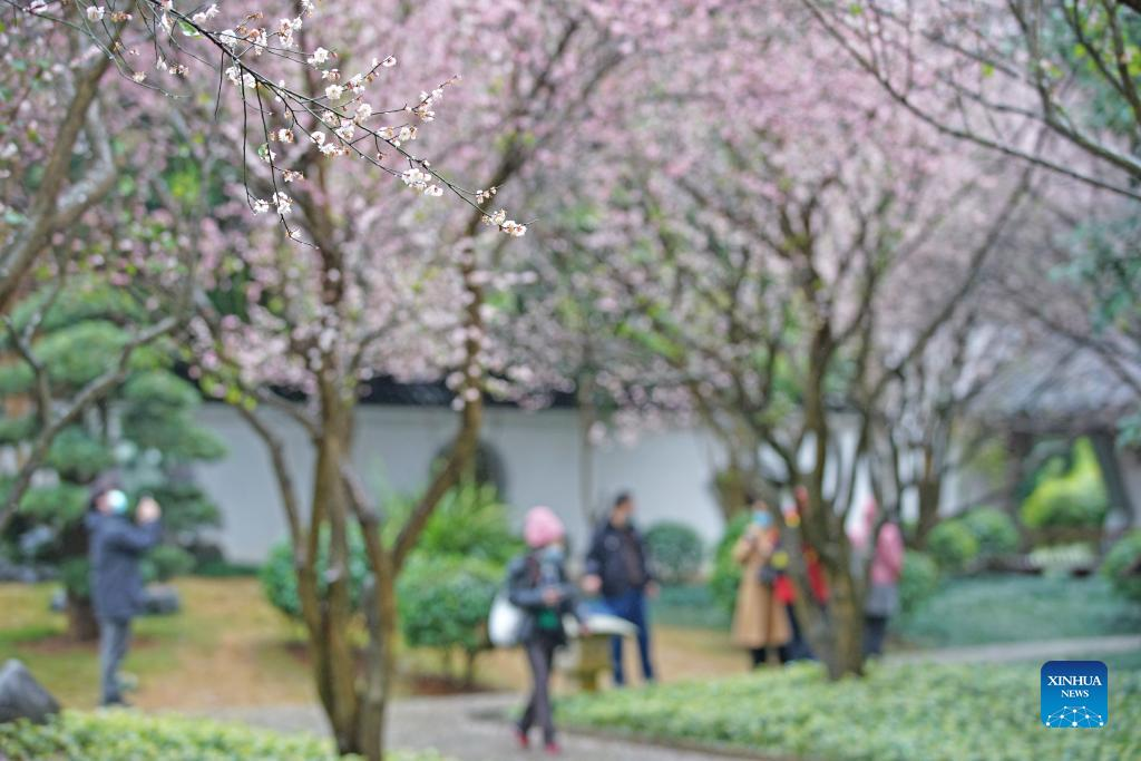 Photo taken on Feb. 13, 2022 shows plum blossoms in Qingxiu Mountain scenic area in Nanning, south China's Guangxi Zhuang Autonomous Region. The Qingxiu Mountain scenic area has attracted many tourists as plum trees are in blossom in early spring. (Xinhua/Zhou Hua)