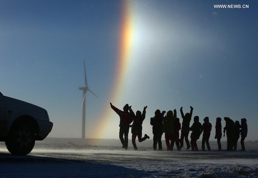People enjoy the rainbow along the No. 207 National Highway in Xilinhot, north China's Inner Mongolia Autonomous Region, Jan. 10, 2017.(Xinhua/Wang Xibao)