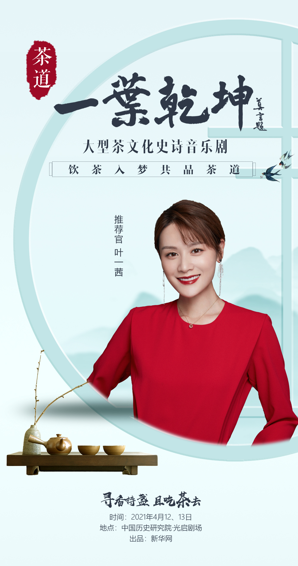 一茶一世界,一葉一乾坤。由新華網(wǎng)獨(dú)家出品的大型茶文化史詩(shī)音樂(lè)劇《茶道:一葉乾坤》將于2021年4月12日-13日在中國(guó)歷史研究院光啟劇場(chǎng)隆重上演?!恫璧溃阂蝗~乾坤》推薦官葉一茜向您發(fā)出邀請(qǐng),邀您共賞葉中乾坤,以茶會(huì)友,共品茶道。