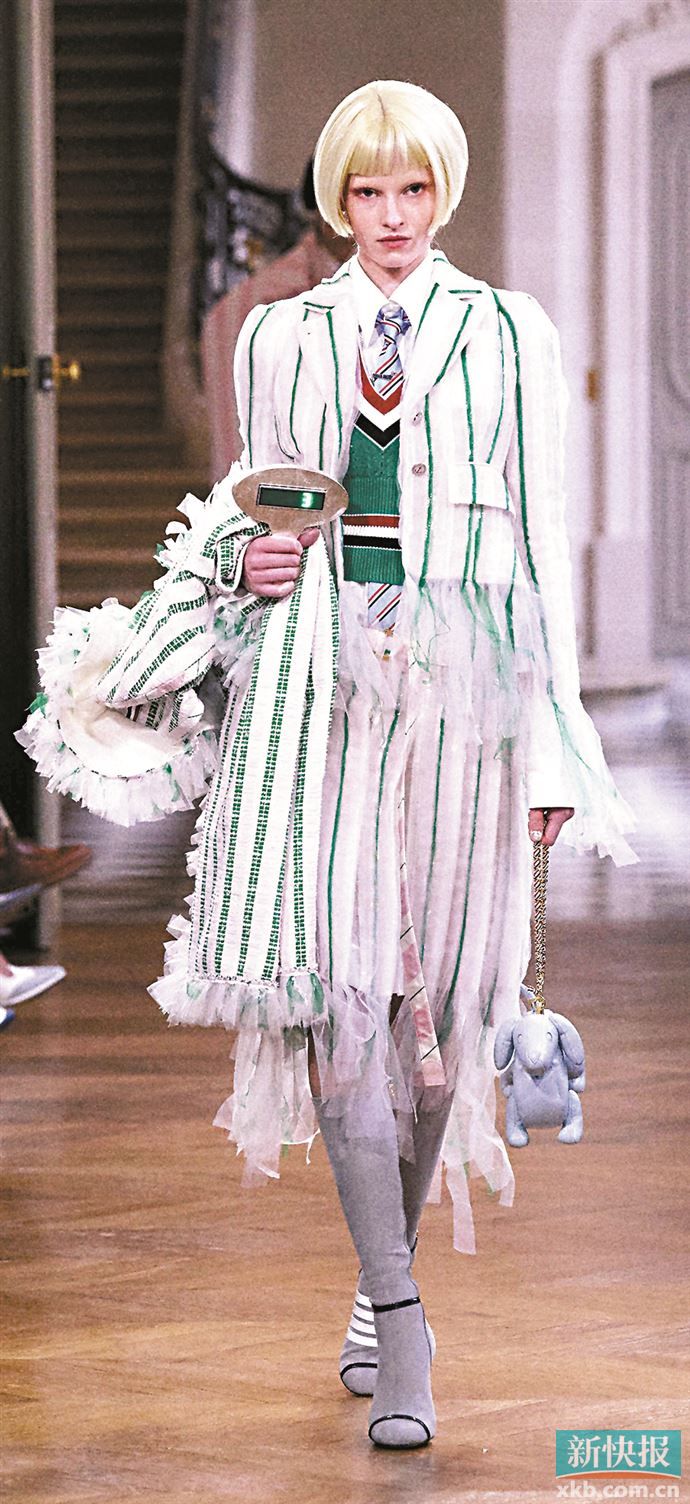还有帽子,斜戴露出半边额头或堆叠佩戴;耳饰单边佩戴或选长短不一的耳坠;腰带斜挎腰间或多条叠搭——这些“叛逆”的用法都为营造不经意的失序感贡献力量,于整体造型的细节中挑战严肃审美。(记者 梁彧)