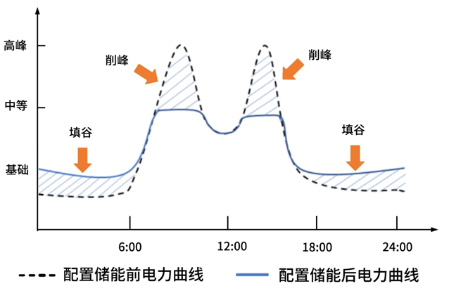 再比如,在工商业用户端,电网存在峰谷电价差,储能系统通过在电价低的谷段从电网充电,在电价高的峰段释放储存的电能供用户使用,实现削峰填谷,降低用电成本,如下图所示: