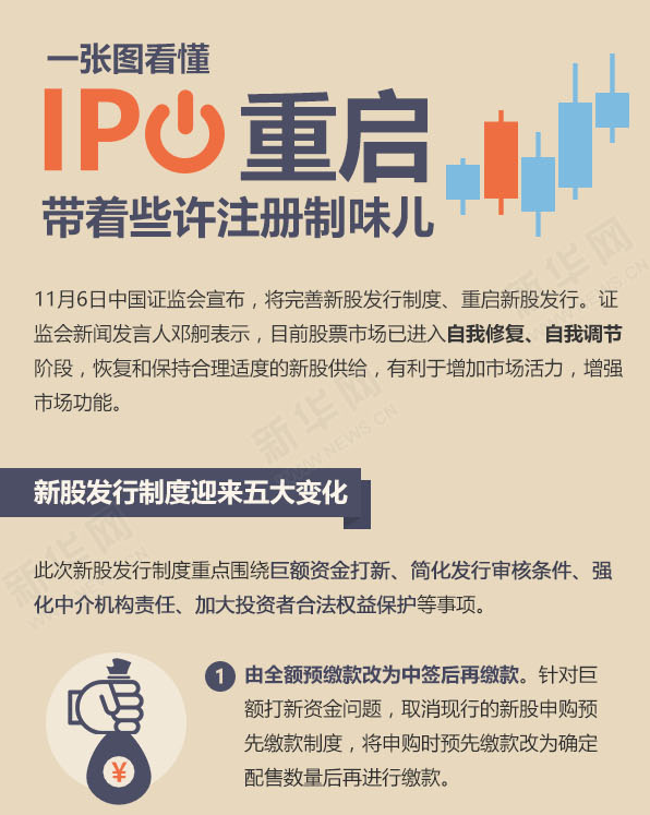 ????新華網(wǎng)北京11月6日電(記者 屈紹輝)6日中國證監(jiān)會宣布,將完善新股發(fā)行制度重啟新股發(fā)行。證監(jiān)會相關(guān)負責人表示,此次改革重點圍繞解決巨額資金打新、簡化發(fā)行審核條件、強化中介機構(gòu)責任、加大投資者合法權(quán)益保護等事項,這是新股發(fā)行體制改革的進一步深化,朝著股票注冊制改革的方向又邁出了堅實的一步。
