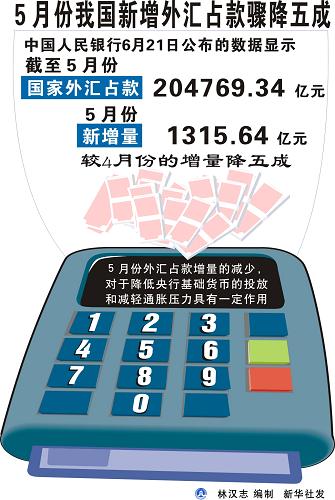 5月份我國新增外匯占款驟降五成