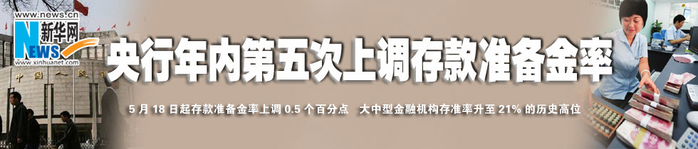 央行12日晚間宣布,從5月18日起,上調(diào)存款準(zhǔn)備金率0.5個(gè)百分點(diǎn)。這是央行年內(nèi)第五次上調(diào)存款準(zhǔn)備金率,也是去年以來第十一次上調(diào)。本次上調(diào)大約可鎖定商業(yè)銀行3700億元資金。 [詳細(xì)]