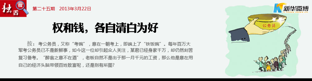 如果千萬富翁考上公務員 千萬富翁考公務員折射的是某些政府部門“門難進、事難辦”的現(xiàn)狀,也反映出當下企業(yè)的生存無奈。假設他有朝中舉,好的結果是政府吸納了一名懂經(jīng)濟的得力干將,壞的結果則是又多出一個亦官亦商的“紅頂商人”。