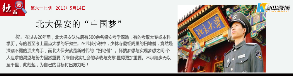 心有多大,舞臺(tái)就有多大,有夢(mèng)就有希望,北大的保安有夢(mèng)。可更重要的是,他們擁有了能讓夢(mèng)實(shí)現(xiàn)的舞臺(tái),北大保安已經(jīng)擁有了。