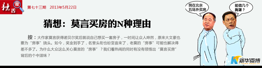 藝術(shù)來源于生活,高于生活,老百姓的房事故事何其多?或許莫言的下部小說就是根據(jù)自身經(jīng)歷寫作的《莫言房事》,定能再次獲得諾獎。到時,莫言老師將用全部獎金在北京六環(huán)外買得一套別野。