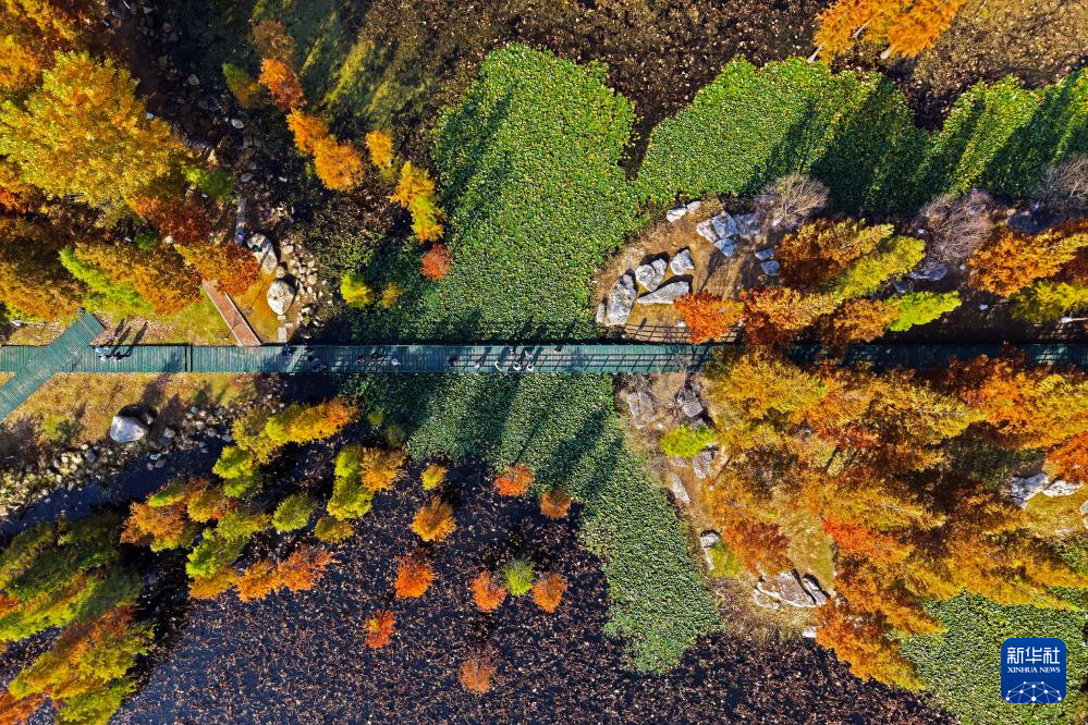 11月5日,游客在山东省烟台市牟平区鱼鸟河湿地公园赏景游玩(无人机照片)。