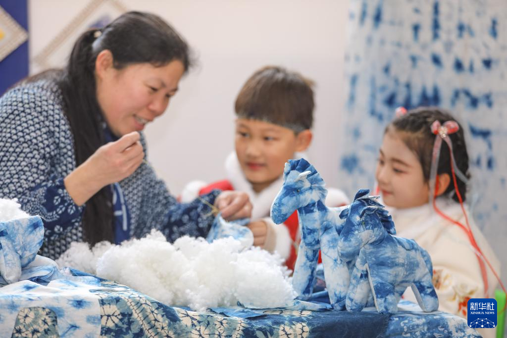 1月16日,在山东省青岛市李沧区夏庄路幼儿园,小朋友跟着老师学习缝制扎染马。