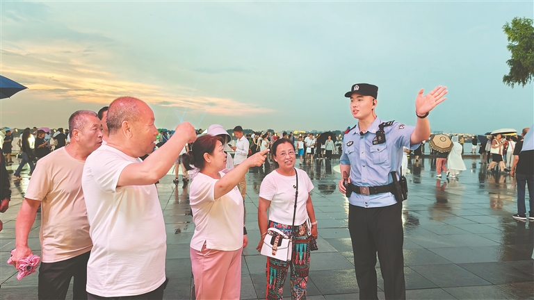 哈爾濱市公安局的民警在防洪紀念塔附近服務(wù)游客。