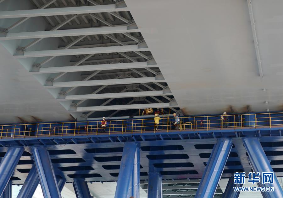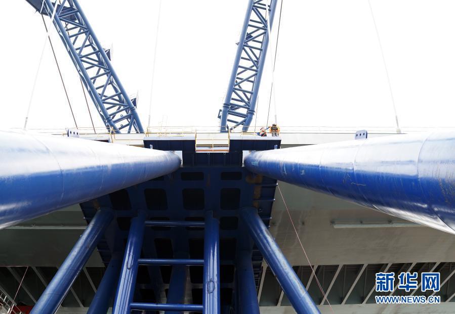 “冒出來”的并不是一座完整的大橋,而是一段跨徑長達(dá)200米的雙拱鋼橋,在海面中央兀然矗立。“這是我們大橋工程最核心的主橋部分,技術(shù)難度最大,對整個(gè)項(xiàng)目有里程碑的意義?!背薪▎挝恢袊窐蚬こ逃邢薰径隆㈨?xiàng)目總指揮闞軍說。