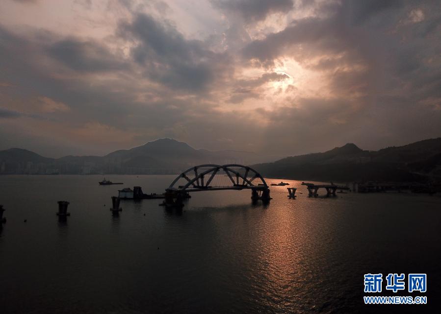 2月25日傍晚,將軍澳海灣斜陽夕照,波光粼粼。遠(yuǎn)遠(yuǎn)看去,一艘巨大的駁船“馱”著一座雙拱鋼橋靜靜地停泊在海面中間。