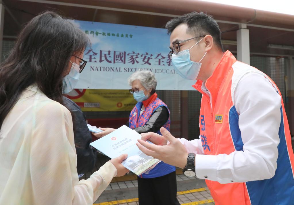 2021年4月15日,香港市民張琪騰(右)在全民國(guó)家安全教育日活動(dòng)上宣講國(guó)家安全理念。新華社記者 吳曉初 攝