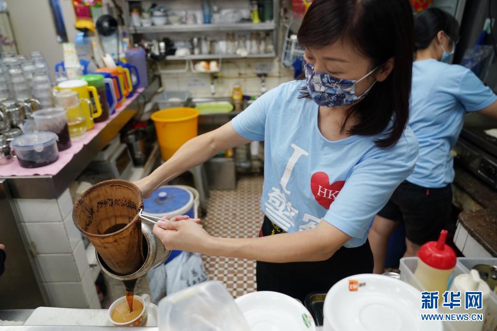 在香港鯉魚(yú)門“銀龍咖啡茶座”餐廳,女老板李凱瑚在為客人制作招牌奶茶(7月26日攝)。 新華社記者 王申 攝