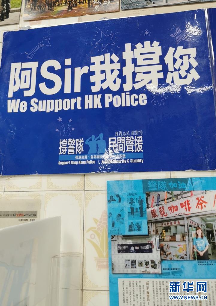 香港鯉魚(yú)門“銀龍咖啡茶座”餐廳內(nèi)張貼著許多撐警的海報(bào),這張海報(bào)是2019年6月30日李凱瑚從萬(wàn)人撐警大會(huì)上領(lǐng)回的(7月26日攝)。 新華社記者 陸敏 攝