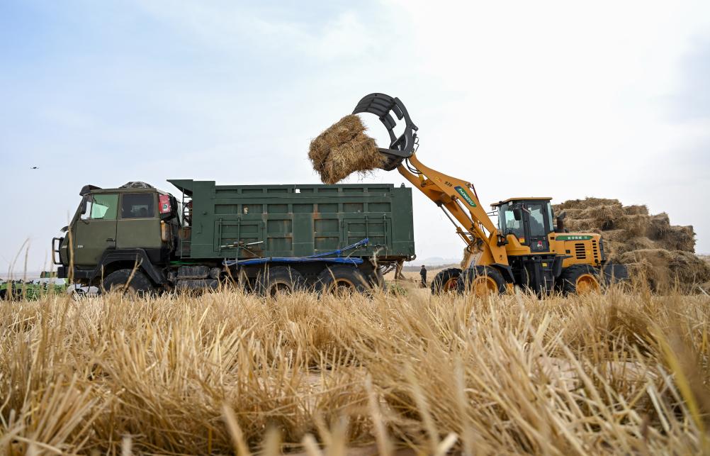 2月28日,大型机械在内蒙古阿拉善盟境内的乌兰布和沙漠装运草料。