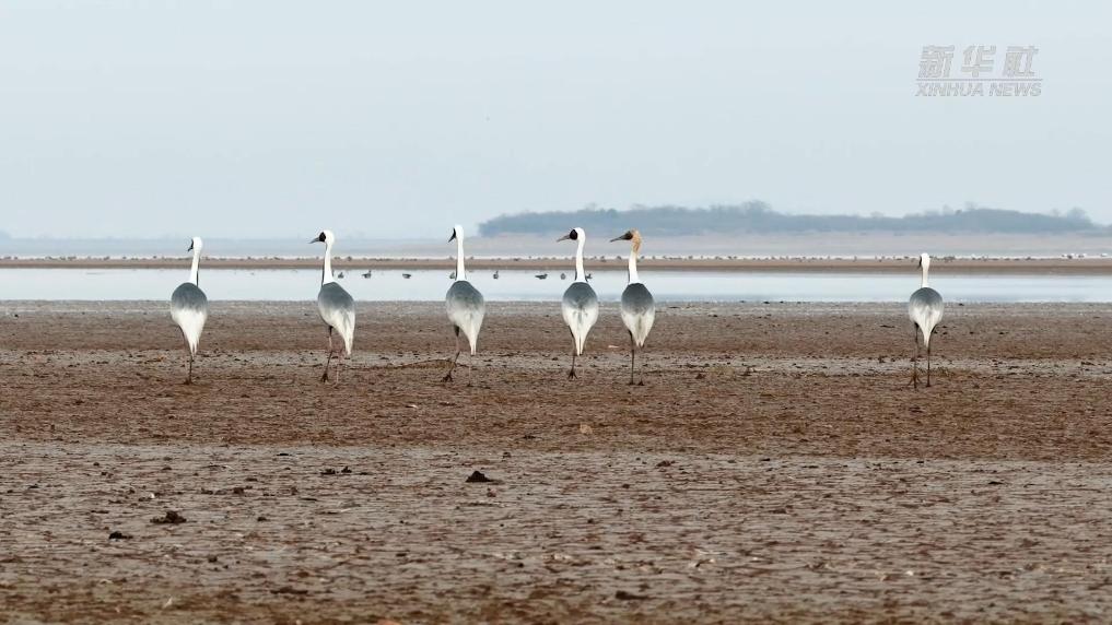 “閑庭信步”鄱陽湖 多只白枕鶴同框