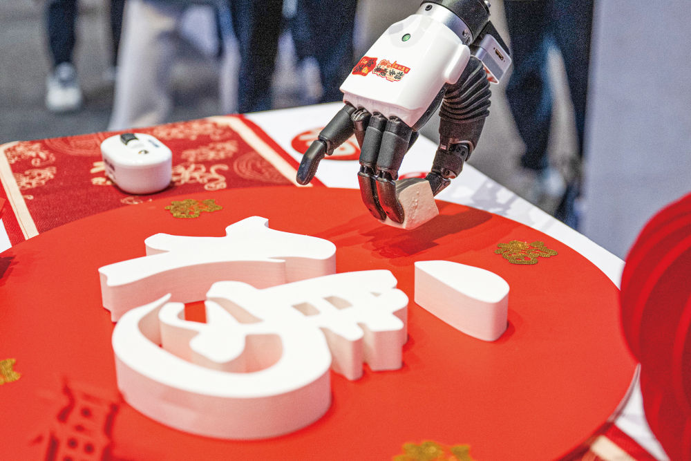 2月24日,人形机器人在湖北“全省加快建成中部地区崛起的重要战略支点推进大会”现场展示抓取豆腐。新华社记者肖艺九摄