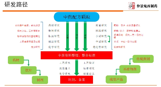 中藥配方顆粒的研制路線是從產(chǎn)品研制開始,要經(jīng)過標準復(fù)核、現(xiàn)場檢查、專家評審等環(huán)節(jié),最終需獲得藥監(jiān)管理部門的備案許可。研制路徑的重點主要是前期大量文獻的調(diào)研、過程中質(zhì)量控制的一致性研究和工藝的穩(wěn)定性、有效性再評價等,對企業(yè)的研發(fā)、人才及經(jīng)濟方面的投入要求非常高。
