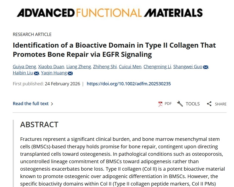 近日,国际期刊《Advanced Functional Materials》刊发了东阿阿胶股份有限公司与北京化工大学联合完成的研究成果,题为《Identification of a Bioactive Domain in Type II Collagen That Promotes Bone Repair via EGFR Signaling》。在骨质疏松等中老年常见的骨骼疾病中,骨髓间充质干细胞(BMSCs)的分化失衡是导致骨折风险升高的重要因素。该研究从骨II型胶原蛋白中鉴定出一条活性胶原蛋白肽(氨基酸序列:GFPGTPGLPGVK),可促进BMSCs向成骨分化,同时抑制其成脂分化。机制研究表明,该肽通过与BMSCs表面的表皮生长因子受体(EGFR)结合,定向调控细胞命运,即活性胶原蛋白肽通过引导BMSCs向成骨分化、抑制成脂分化,这对治疗相关骨损伤疾病具有重要意义。