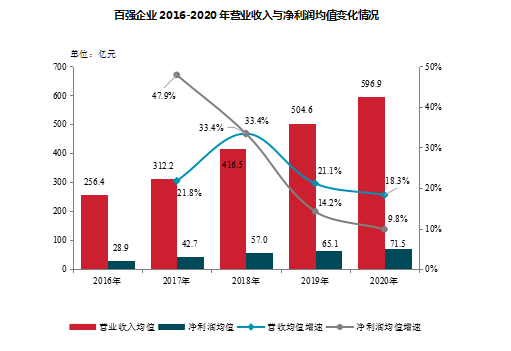 報(bào)告指出,百?gòu)?qiáng)企業(yè)營(yíng)收與凈利潤(rùn)保持增長(zhǎng)態(tài)勢(shì),盈利能力持續(xù)下行。百?gòu)?qiáng)企業(yè)銷售業(yè)績(jī)的穩(wěn)步增長(zhǎng)帶動(dòng)其營(yíng)業(yè)收入和凈利潤(rùn)的持續(xù)增加,2020年,百?gòu)?qiáng)企業(yè)營(yíng)業(yè)收入均值達(dá)596.9億元,凈利潤(rùn)均值達(dá)71.5億元,分別同比增長(zhǎng)18.3%、9.8%,增速較上年減少2.8、4.4個(gè)百分點(diǎn)。百?gòu)?qiáng)企業(yè)凈利潤(rùn)率、凈資產(chǎn)收益率均值分別為11.2%、14.4%,同比降低0.7、1.0個(gè)百分點(diǎn)。