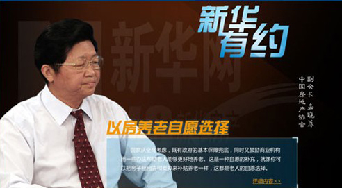 9月13日,國務(wù)院發(fā)布了《關(guān)于加快發(fā)展養(yǎng)老服務(wù)業(yè)的若干意見》 (以下簡稱《意見》,重點提出“開展老年人住房反向抵押養(yǎng)老保險試 點”,在網(wǎng)上引起熱議。9月26日,匯利基金董事長、幸福人壽原董事 長孟曉蘇教授做客由新華房產(chǎn)和新華網(wǎng)采訪部聯(lián)合推出的《新華有約》 欄目,與網(wǎng)友交流如何看待“以房養(yǎng)老”等熱點話題。